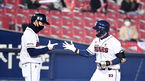 [OSEN=부산, 김성락 기자] 30일 오후 부산 사직야구장에서 '2021 신한은행 SOL KBO리그' 롯데 자이언츠와 한화 이글스의 경기가 열렸다.1회초 1사 만루 한화 노시환의 선취 1타점 적시타 때 득점을 올린 3루 주자 노수광이 더그아웃에