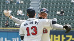 [OSEN=잠실,민경훈 기자] 2일 오후 서울 잠실구장에서 2021 신한은행 SOL KBO리그 두산 베어스와 SSG 랜더스의 경기가 열렸다.5회초를 마친 두산 선발 유희관이 환하게 미소지으며 김재환과 하이파이브를 하고 있다./ rumi@osen.co.kr