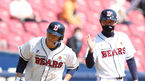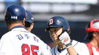 [OSEN=잠실,민경훈 기자] 2일 오후 서울 잠실구장에서 2021 신한은행 SOL KBO리그 두산 베어스와 SSG 랜더스의 경기가 열렸다.3회초 1사 주자 1루 두산 박계범이 좌월 동점 투런홈런을 날린 후 홈을 밟으며 김주찬 코치와 하이파이브를