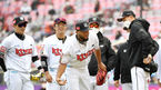 [OSEN=수원 , 곽영래 기자] 2일 오후 수원 KT위즈파크에서 '2021 신한은행 SOL KBO리그' KT 위즈와 KIA 타이거즈의 경기가 열렸다.2회초 무사 KT 데스파이네가 KIA 김민식의 타구에 맞은 뒤 몸 상태를 체크하고 있다. /youngrae@osen.co.kr