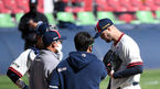[OSEN=잠실, 이대선 기자] 5일 오후 서울 잠실야구장에서 ’2021 신한은행 SOL KBO 리그' 두산 베어스와 LG 트윈스의 경기가 열렸다.5회초 2사 2루에서 마운드를 방문한 두산 정재훈 코치가 로켓과 이야기를 나누고 있다./sunday@osen.co.