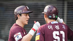 [OSEN=잠실,박준형 기자] 12일 오후 서울 잠실야구장에서 ‘2021 신한은행 SOL KBO리그’두산 베어스와 키움 히어로즈의 경기가 진행됐다.3회초 키움 선두타자 박동원이 선취 솔로홈런을 날리고 이정후와 하이파이브를 하고 있