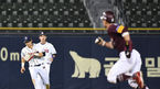 [OSEN=광주, 이대선 기자] 13일 오후 광주-기아 챔피언스필드에서 ’2021 신한은행 SOL KBO 리그' KIA 타이거즈와 LG 트윈스의 경기가 열렸다.5회초 1사에서 LG 송은범이 호수비를 펼친 신민재를 향해 엄지를 들어 올리고 있다. /sunday@o