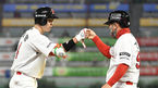 [OSEN=잠실, 지형준 기자] 14일 오후 서울 잠실야구장에서 ‘2021 신한은행 SOL KBO리그’ LG 트윈스와 삼성 라이온즈의 경기가 열렸다.7회말 무사에서 LG 정주현이 3루타를 날리고 박용근 코치와 기뻐하고 있다. /jpnews@osen.co.kr