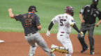 [OSEN=고척,박준형 기자] 16일 오후 고척스카이돔에서 '2021 신한은행 SOL KBO리그' 키움 히어로즈와 한화 이글스의 경기가 진행됐다.1회말 2사 키움 이정후의 안타때 수비 시프트를 펼천던 하주석이 타구를 놓친뒤 아쉬워하고 있다. /