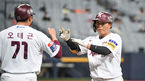 [OSEN=고척,박준형 기자] 16일 오후 고척스카이돔에서 '2021 신한은행 SOL KBO리그' 키움 히어로즈와 한화 이글스의 경기가 진행됐다.7회말 1사 1,3루 키움 박동원이 3점 홈런을 날리고 송우현과 전병우의 축하를 받고 있다. 박동원은 5