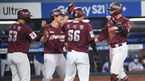[OSEN=대구,박준형 기자] 18일 대구삼성라이온즈파크에서 ‘2021 신한은행 SOL KBO리그’ 삼성 라이온즈와 키움 히어로즈의 경기가 진행됐다6회초 2사 만루 키움 전병우가 만루홈런을 날리고 동료들의 축하를 받고 있다. / soul1