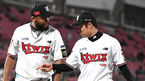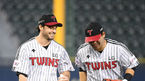[OSEN=잠실, 지형준 기자] 18일 오후 서울 잠실야구장에서 ‘2021 신한은행 SOL KBO리그’ LG 트윈스와 NC 다이노스의 경기가 열렸다.4회초 수비를 마친 LG 수아레즈가 김민성과 이야기를 나누며 미소 짓고 있다. 수아레즈는 2사에