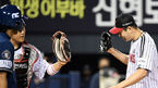 [OSEN=잠실, 지형준 기자] 18일 오후 서울 잠실야구장에서 ‘2021 신한은행 SOL KBO리그’ LG 트윈스와 NC 다이노스의 경기가 열렸다.8회초 2사 만루에서 LG 김대유가 NC 나성범을 좌익수 플라이로 처리하며 유강남과 기뻐하고 있