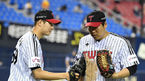 [OSEN=잠실, 지형준 기자] 18일 오후 서울 잠실야구장에서 ‘2021 신한은행 SOL KBO리그’ LG 트윈스와 NC 다이노스의 경기가 열렸다.8회초 2사 만루에서 LG 김대유가 NC 나성범을 좌익수 플라이로 처리하며 김현수와 기뻐하고 있