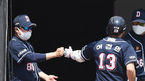 [OSEN=수원, 민경훈 기자] 19일 오후 경기도 수원시 수원kt위즈파크에서 ‘2021 신한은행 SOL KBO 리그’ KT 위즈와 두산 베어스의 경기가 열렸다.1회초 두산 선두타자 허경민이 좌월 선취 솔로홈런을 날린 후 덕아웃에서 김태형