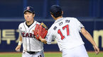 [OSEN=잠실, 조은정 기자] 22일 오후 서울 잠실구장에서 2021 신한은행 SOL KBO리그 두산 베어스와 롯데 자이언츠의 경기가 열렸다.8회초 1사 만루 두산 3루수 허경민이 롯데 정훈의 병살타를 처리하며 이닝을 마친 뒤 투수 홍건희와
