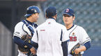 [OSEN=잠실,박준형 기자] 27일 오후 서울 잠실구장에서 2021 신한은행 SOL KBO리그 두산 베어스와 한화 이글스의 경기가 진행됐다.3회초 2사 1루 보크 판정 받은 두산 선발투수 곽빈이 마운드 방문한 정재훈 투수 코치와 이야기를 나누