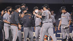 [OSEN=잠실,박준형 기자] 27일 오후 서울 잠실구장에서 2021 신한은행 SOL KBO리그 두산 베어스와 한화 이글스의 경기가 진행됐다.7회말 동점, 역전 위기를 막은 한화 선발투수 김민우가 동료들의 축하를 받으며 더그아웃으로 들어가