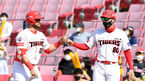 [OSEN=잠실, 민경훈 기자] 30일 오후 서울 잠실야구장에서 ‘2021 신한은행 SOL KBO리그’ LG 트윈스와 키움 히어로즈의 경기가 열렸다.6회말 2사 주자 1,2루 LG 오지환의 우중간 2타점 3루타때 홈을 밟은 홍창기 정주현이 덕아웃
