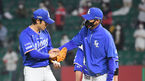 [OSEN=고척, 이대선 기자] 1일 오후 서울 고척스카이돔에서 ’2021 신한은행 SOL KBO 리그' 키움 히어로즈와 롯데 자이언츠의 경기가 열렸다.7회말 2사 1루에서 롯데 나균안이 마운드를 내려가며 이용훈 투수코치와 이야기를 나누