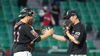 [OSEN=박준형 기자]KT 위즈가 인천 원정 첫 날 기선제압에 성공했다.KT는 8일 인천SSG랜더스필드에서 열린 ‘2021 신한은행 SOL KBO리그' SSG 랜더스와 시즌 6차전에서 4-2 승리를 거뒀다.경기종료 후 KT 김재윤과 장성우 포수가 하이파