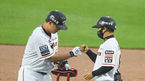 [OSEN=대전,박준형 기자] 15일 오후 대전 한화생명이글스파크에서 2021 신한은행 SOL KBO리그 한화 이글스와 롯데 자이언츠의 경기가 진행됐다.1회말 1사 1루 한화 노시환의 1타점 적시 2루타를 날리고 이상훈 1루 코치와 하이파이브를