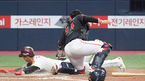 [OSEN=고척,박준형 기자] 1일 오후 서울 고척스카이돔에서 ‘2021 신한은행 SOL KBO리그’ 키움 히어로즈와 롯데 자이언츠의 경기가 진행됐다.7회말 무사 1,3루 키움 김병휘의 내야땅볼때 3루 주자 김혜성이 홈에서 태그아웃되