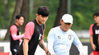 [OSEN=파주, 지형준 기자] 2일 오후 김학범 감독이 이끄는 올림픽 축구대표팀이 파주 국가대표팀 트레이닝센터(NFC)에 소집됐다.김학범 감독이 훈련을 지켜보며 정태욱과 이야기를 나누고 있다.2021.07.02 /jpnews@osen.co.kr