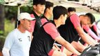 [OSEN=파주, 최규한 기자] 5일 오후 김학범 감독이 이끄는 올림픽 축구대표팀이 파주 국가대표팀 트레이닝센터(NFC)에서 훈련을 진행했다.올림픽 축구대표팀 김학범 감독이 웜업에 나서며 선수들과 대화를 나누고 있다.2021.07.05 / dr