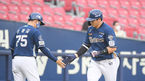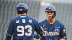 [OSEN=잠실,박준형 기자] 6일 오후 서울 잠실구장에서 2021 신한은행 SOL KBO리그 두산 베어스와 NC 다이노스의 경기가 진행됐다.2회초 NC 선두타자 나성범이 선취 솔로홈런을 날리고 이동욱 감독과 하이파이브를 하고 있다. 21.07.06 / so