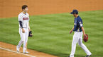 [OSEN=잠실,박준형 기자] 6일 오후 서울 잠실구장에서 2021 신한은행 SOL KBO리그 두산 베어스와 NC 다이노스의 경기가 진행됐다.7회말 이닝종료 후 3루 주자 박건우가 NC 이용찬과 인사를 나누고 있다. 21.07.06 / soul1014@osen.co.kr