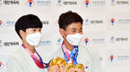 [OSEN=인천공항, 민경훈 기자] 1일 오후 인천공항 제2터미널을 통해 2020 도쿄올림픽을 마친 국가대표 선수들이 귀국했다.양궁대표팀 안산과 김제덕이 금메달을 들고 포즈를 취하고 있다. 2021.08.01 /rumi@osen.co.kr