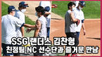 [OSEN=인천,박준형 기자] SSG 김찬형이 18일 오후 인천 SSG랜더스필드에서 열리는 2021 신한은행 SOL KBO리그 NC 다이노스와의 홈경기를 앞두고 NC 옛 동료들과 반가운 만남을 가졌다.지난 5월 21일 NC 다이노스에서 SSG로 트레이드 된 김