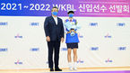[OSEN=용인, 조은정 기자] 8일 오전 용인 실내체육관에서 2021~2022 WKBL 신입선수선발회가 열렸다.KB스타즈 1라운드 4순위로 지명된 선일여고 신예영(173cm)이 김완수 감독과 포즈를 취하고 있다. 2021.09.08 /cej@osen.co.kr