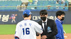 [OSEN=대구, 이대선 기자] 15일 오후 대구삼성라이온즈파크에서 ’2021 신한은행 SOL KBO리그’ 삼성 라이온즈와 키움 히어로즈의 경기가 열렸다.클리닝 타임 때 그라운드에 인사 나온 삼성 신인 이재현이 이원석의 격려를 받