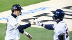 [OSEN=잠실, 이대선 기자] 5일 오후 서울 잠실야구장에서 '2021 신한은행 SOL KBO 리그' 포스트시즌 두산베어스와 LG 트윈스의 준플레이오프(준PO) 2차전이 진행됐다.6회말 무사 2루에서 두산 김재환이 중전 적시타를 치고 환호하고 있