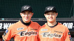 [OSEN=대전, 최규한 기자] 한화 이글스가 5일 대전 한화생명이글스파크에서 2021시즌 마무리캠프를 꾸리고 훈련에 나섰다.한화 2022 신인 문동주(오른쪽)과 박준영이 인터뷰를 앞두고 유니폼을 입고 포즈를 취하고 있다. 2021.11.05 / dr