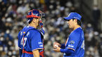 [OSEN=잠실, 이대선 기자] 10일 오후 서울 잠실야구장에서 '2021 신한은행 SOL KBO 리그' 포스트시즌 플레이오프(PO) 2차전 두산 베어스와 삼성 라이온즈의 경기가 열렸다.3회초 1사 1,2루에서 마운드를 방문한 삼성 강민호가 원태인과