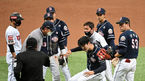 [OSEN=고척, 김성락 기자] 14일 오후 서울 고척스카이돔에서 KT 위즈와 두산 베어스의 2021시즌 KBO리그 한국시리즈 1차전이 열렸다.3회말 2사 두산 곽빈이 KT 황재균의 투수 강습 타구에 허벅지를 맞은 뒤 동료들의 부축을 받으며 더