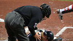 [OSEN=고척, 지형준 기자] 15일 오후 서울 고척스카이돔에서 KT 위즈와 두산 베어스의 2021시즌 KBO리그 한국시리즈 2차전이 열렸다.1회초 2사 1,2루에서 두산 박세혁이 파울 타구에 마스크를 맞고 괴로워하고 있다. 2021.11.15 /jpnews@osen.c