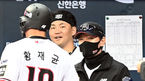 [OSEN=고척, 조은정 기자] 15일 오후 서울 고척스카이돔에서 KT 위즈와 두산 베어스의 2021시즌 KBO리그 한국시리즈 2차전이 열렸다.1회말 1사 KT 황재균이 선취 좌월 솔로 홈런을 때려낸 뒤 이강철 감독의 환영을 받고 있다. 2021.11.15 /