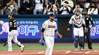 [OSEN=고척,박준형 기자] 17일 오후 서울 고척스카이돔에서 두산 베어스와 KT 위즈의 2021시즌 KBO리그 한국시리즈 3차전이 열렸다.1회초 이닝종료 후 두산 선발투수 미란다가 박세혁 포수를 향해 손짓하고 있다. 2021.11.17/ soul1014@osen.