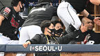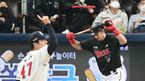 [OSEN=고척, 이대선 기자] 18일 오후 서울 고척스카이돔에서 두산 베어스와 KT 위즈의 2021시즌 KBO리그 한국시리즈 4차전이 열렸다.1회초 2사 1,3루에서 KT 장성우의 좌중간 적시타 때 박경수가 더그아웃에서 홈을 밟은 황재균을 축하