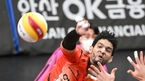 [OSEN=안산,박준형 기자] 11일 오후 경기도 안산시 상록수체육관에서 ‘도드람 2021-2022 V-리그’ 남자부 안산 OK금융그룹과 천안 현대캐피탈의 경기가 진행됐다.2세트 OK금융그룹 박원빈이 강타를 날리고 있다. 2022.01.11 / soul101