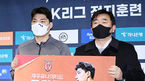 [OSEN=제주(서귀포), 민경훈 기자] 12일 오전 제주 서귀포 빠레브 호텔 기자회견장에서 K리그 동계 전지훈련 미디어캠프가 진행됐다.기자회견 전 제주 주민규의 제주도 유소년 축구 발전 기금 기탁 행사가 진행되고 있다. 2022.01.12 /