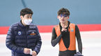 [OSEN=태릉,박준형 기자] 14일 서울 태릉국제스케이트장에서 제48회 전국남녀 스프린트 및 제76회 종합 스피드 선수권대회가 진행됐다.남자 10000M, 1위를 차지한 정재원이 코치와 이야기를 나누고 있다. 2022.01.14 / soul1014@osen.co.kr