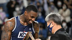 [OSEN=전주, 이대선 기자] 전주 KCC는 19일 전주실내체육관에서 열린 2021-2022 KGC인삼공사 정관장 프로농구 정규리그 고양 오리온을 86-71로 꺾었다.4쿼터 KCC 최형길 단장이 5,236 리바운드를 달성한 라건아에게 기념품을 전달하고 있다