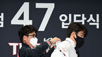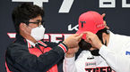 [OSEN=광주, 이대선 기자] 19일 오후 광주 기아챔피언스필드에서 자유계약선수(FA) 계약으로 팀에 합류한 나성범의 입단식이 열렸다.KIA 장정석 단장이 나성범에게 모자를 씌워주고 있다. 2022.01.19 /sunday@osen.co.kr