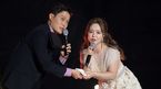 [OSEN=조은정 기자] 4일 오후 서울 영등포구 타임스퀘어 CGV 영등포에서 금잔디 데뷔 20주년 기념 정규 앨범 ‘당신은 명작’ 발매 쇼케이스가 열렸다.가수 금잔디가 코미디언 송중근에게 휴지를 건네받고 있다. 2022.2.4 /cej@ose