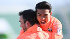 [OSEN=제주, 최규한 기자] 20일 오후 제주월드컵경기장에서 '하나원큐 K리그1 2022' 제주 유나이티드와 포항 스틸러스의 경기가 열렸다.후반 포항 허용준이 팀 두번째 골을 작렬시킨 뒤 김기동 감독과 인사를 나누고 있다. 2022.02.20 /