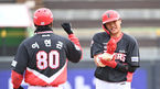 [OSEN=수원,박준형 기자] 17일 경기도 수원시 수원KT위즈파크에서 2022 KBO리그 시범경기 KT 위즈와 KIA 타이거즈의 경기가 진행됐다.4회초 KIA 선두타자 김석환이 2루타를 날리고 이현곤 1루 코치와 하이파이브를 하고 있다. 2022.03.17 / s