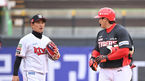 [OSEN=수원,박준형 기자] 17일 경기도 수원시 수원KT위즈파크에서 2022 KBO리그 시범경기 KT 위즈와 KIA 타이거즈의 경기가 진행됐다.3회초 2사 3루 KIA 나성범이 선취 1타점 적시타를 날린뒤 KT 박경수와 이야기를 하고 있다. 2022.03.17 / so