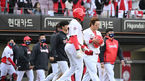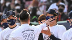 [OSEN=잠실, 지형준 기자] 3일 서울 잠실야구장에서 2022 신한은행 SOL KBO리그 두산 베어스와 한화 이글스의 시즌 2차전을 마치고 유희관의 은퇴식이 열렸다.유희관이 동료선수들과 인사를 나누며 장난을 치고 있다. 2022.04.03 /jpnews@o