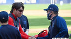 [OSEN=창원, 이석우 기자] 15일 창원 NC파크에서 ‘2022 신한은행 SOL KBO리그’ NC 다이노스와 KIA 타이거즈의 경기가 열린다.개막 후 처음으로 창원 NC파크를 찾은 이적생 KIA 나성범이 이동욱 감독에게 인사를 하고 있다. 2022.04.1